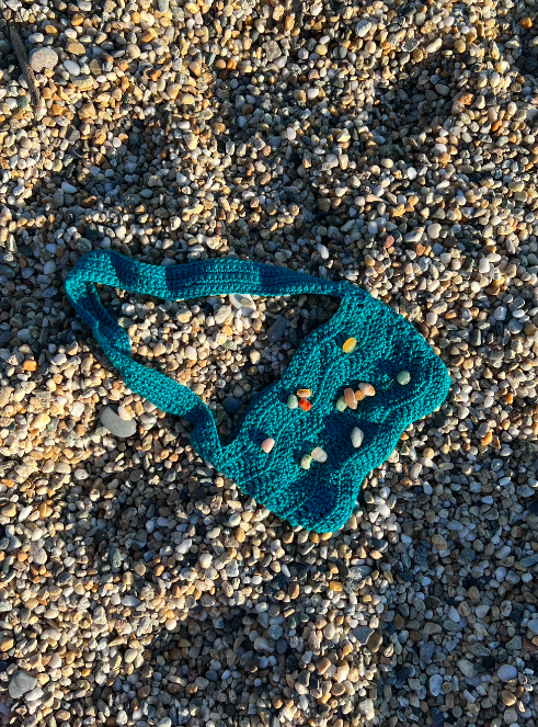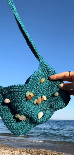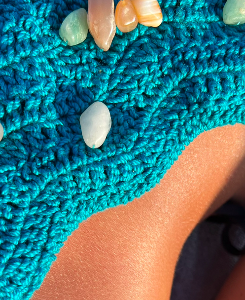 Borsa in filato di cotone turchese con pietre in quarzo applicate.